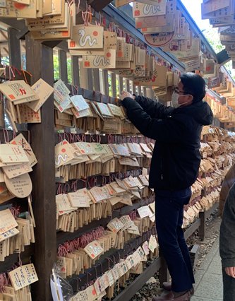 元朝祭の祈祷をいただいた社長の姿がそこにあった。商売繁盛、社内安全を心の内で願いながら絵馬を奉納する社長を、正月の清らかな陽の光が照らしていた。